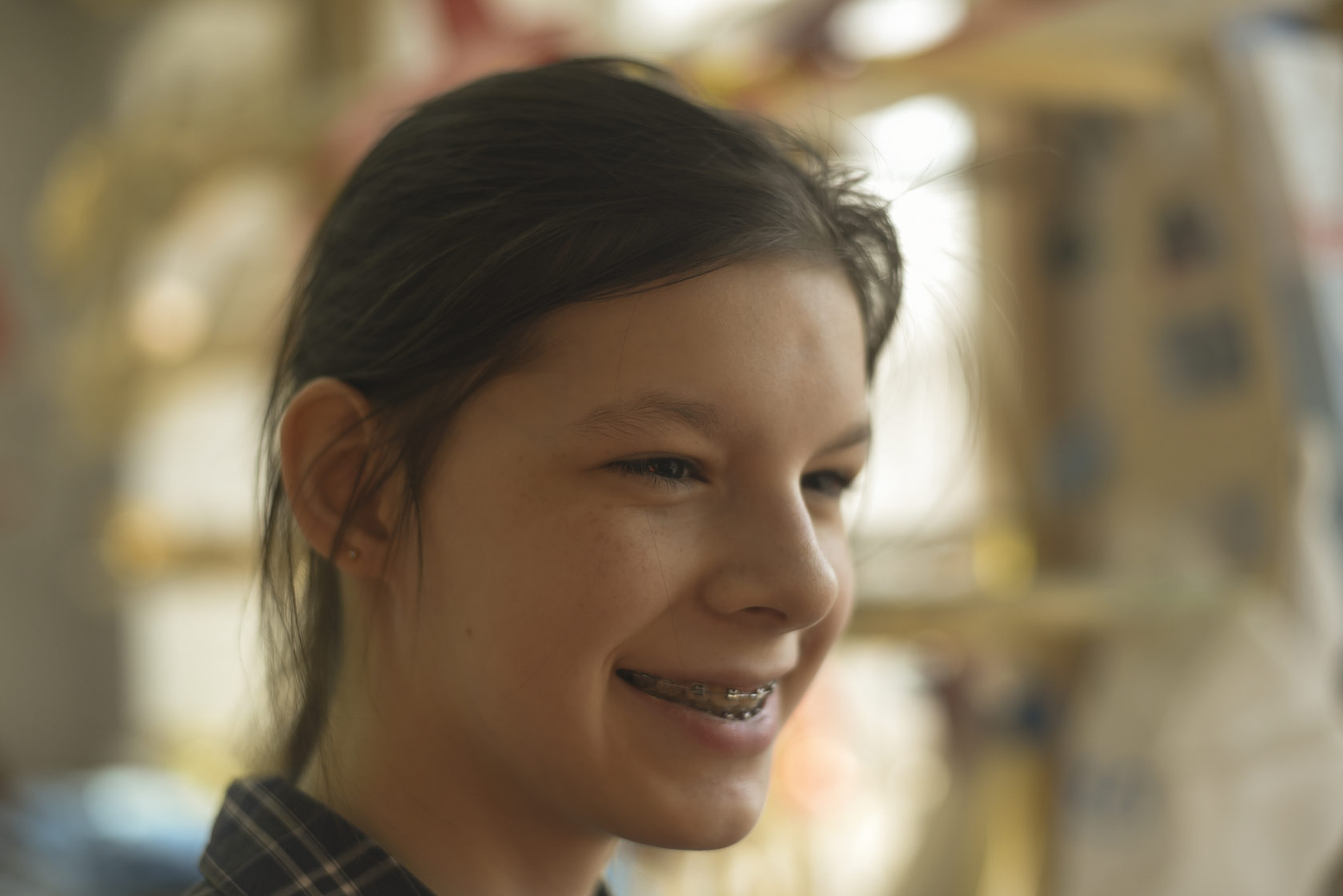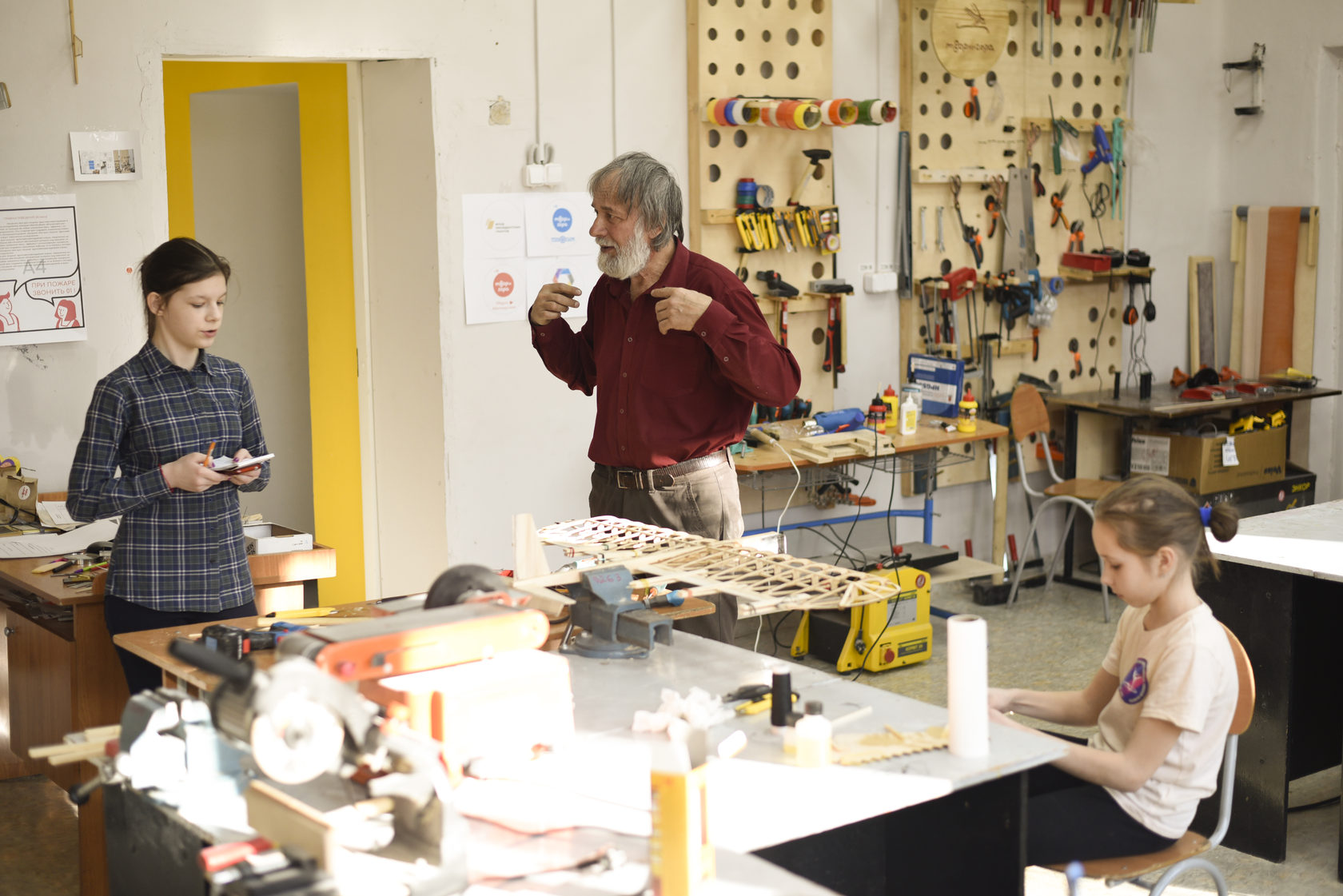 "Мы придумываем модели самолетов, изготавливаем их, запускаем (когда тепло - на улице, а когда прохладно - в зале), управляем 3D моделями на компьютере. Если интересуетесь этим - приходите! Вот, у нас девочка сидит - Маша, осталась тут после занятий, доделовать работу на грантовый конкурс."